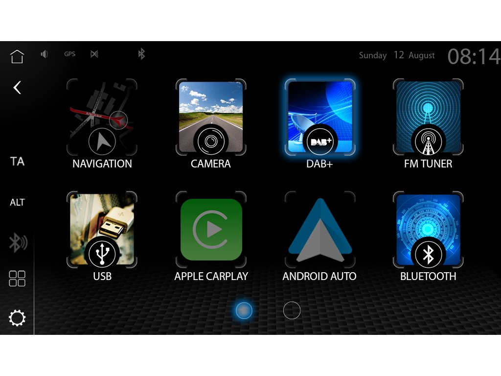 Všechny zdroje a aplikace jsou přehledně zobrazeny, takže všechny funkce lze na první pohled pochopit a přímo vybrat. Je také zobrazeno, která aplikace je k dispozici a lze ji vybrat. Přehledný a dobře strukturovaný displej hraje rozhodující roli při zajištění bezpečného ovládání zařízení během jízdy.