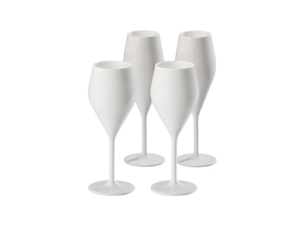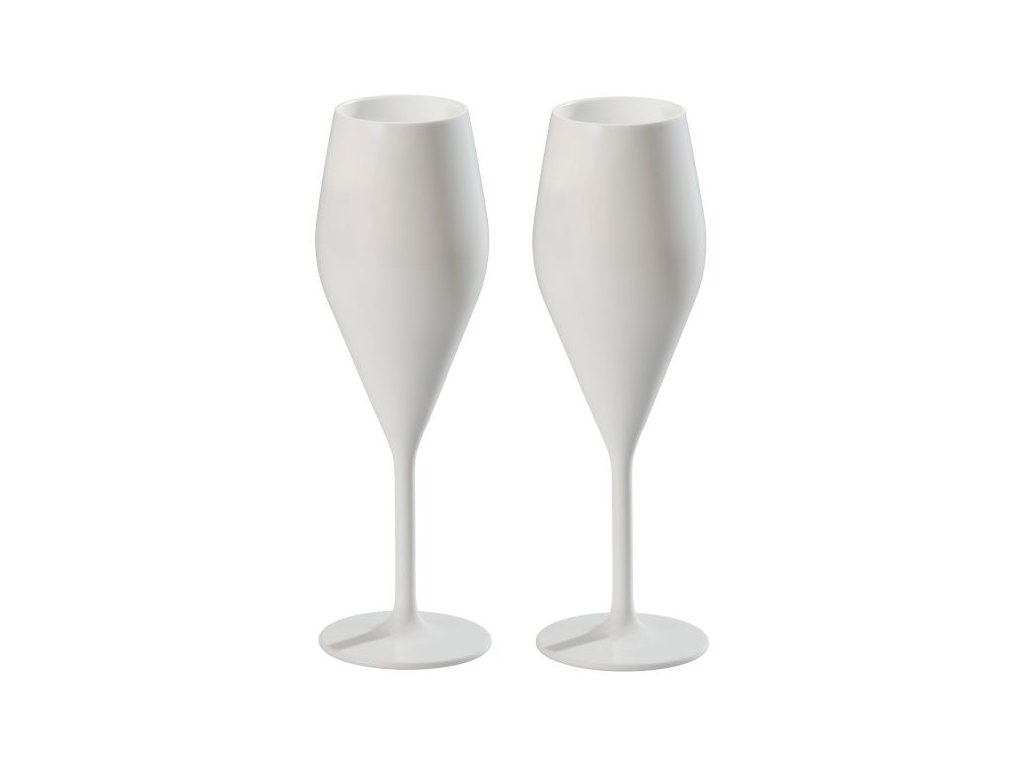 Krásné bílé sklenice na sekt z vysoce kvalitního plastu.