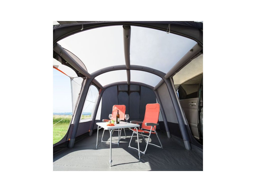 - Pravá boční stěna s rolovacím vchodem a větracím okénkem (gáza/průhledná fólie), které lze uzavřít napůl nebo zcela látkovou vrstvou