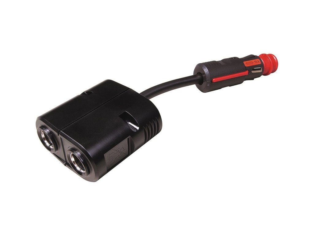 Dvojitá spojka. 2 standardní zásuvky s kontakty podle DIN EN ISO 4165, max. 16 A/ 12-24 V, flexibilní připojení k palubní síti Bezpečnostní univerzální zástrčka s vyměnitelnou pojistkou 16 A.Doplňkové parametry
