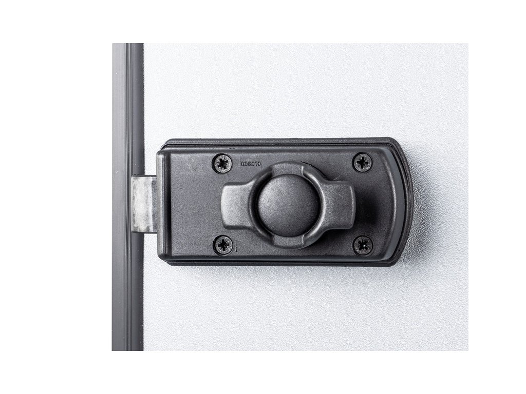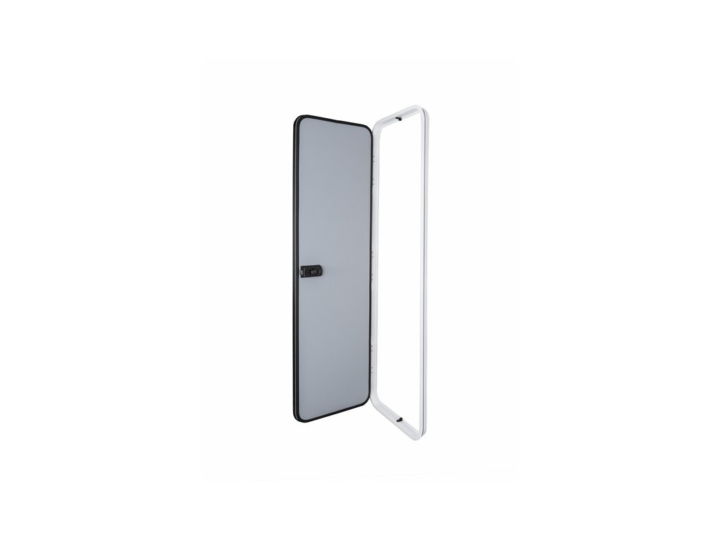 Dveře jsou vyrobeny z kvalitních materiálů zajišťujících odolnost a dlouhou životnost. Hliníkový rám poskytuje optimální poměr pevnosti a hmotnosti, což je klíčové pro mobilní aplikace. Vnější část dveří je rovněž z hliníku, zatímco vnitřní strana je obložena vyvýšeným materiálem ABS, který zlepšuje tepelnou izolaci a zvyšuje odolnost proti mechanickému poškození.