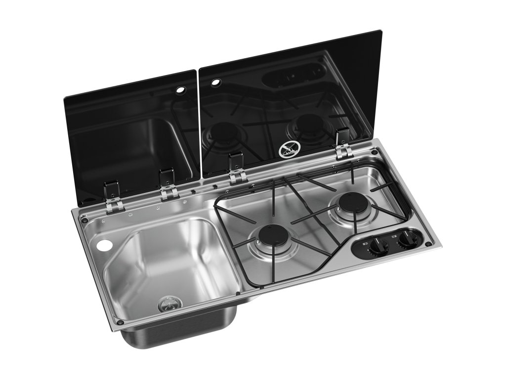 Vestavná varná deska/dřez s krytem z teplotně odolného bezpečnostního skla a funkcí uzavření plynu při zavření krytu