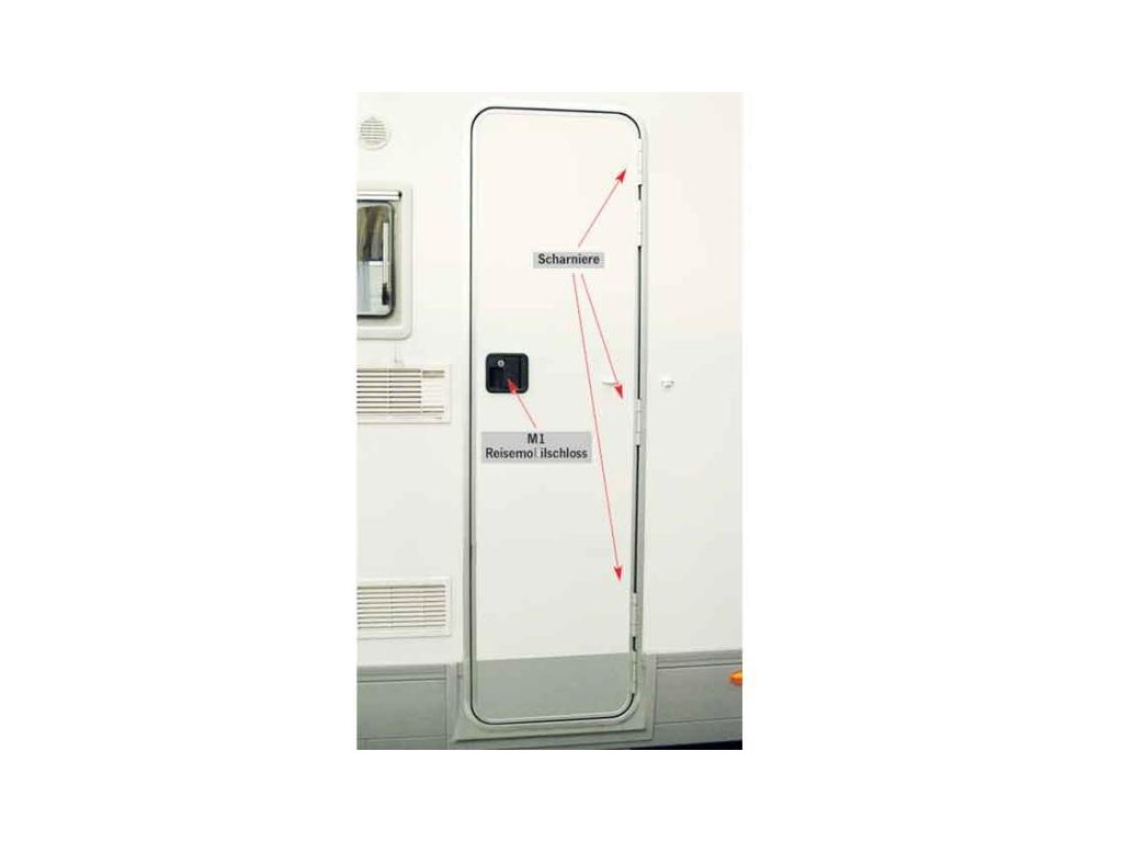 Instalace dveří System 2000 probíhá zevnitř karavanu kombinací lepení a šroubování. Předvrtané otvory v rámu zajišťují přesnou a rychlou montáž bez rizika chyb. Součástí dodávky jsou všechny potřebné komponenty včetně pantů, jejichž počet je přizpůsoben tloušťce stěny vašeho karavanu, a kompletní montážní materiál pro bezproblémovou instalaci.