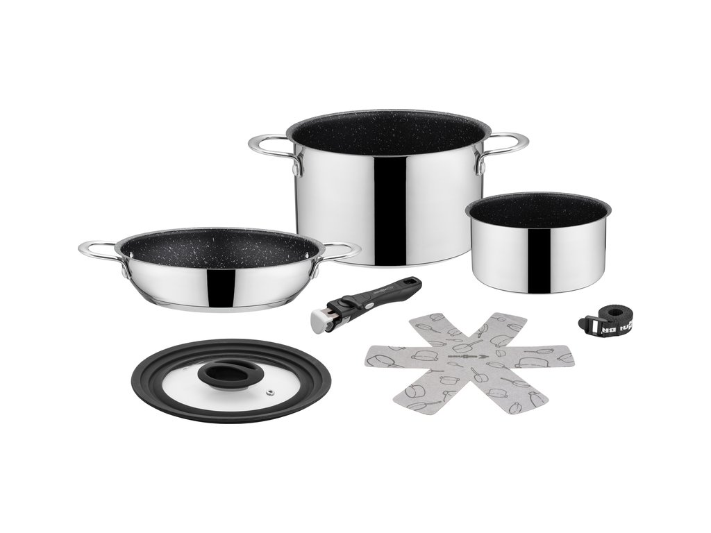 Vysoce kvalitní sada hrnců z nerezové oceli s nepřilnavým povrchem. Prostorově úsporný design. Obzvláště vhodný pro rekreační vozidla a lodě. Velký hrnec a pánev jsou vybaveny robustními rukojeťmi a termoizolačním dnem. Jsou vhodné pro plynové, elektrické, sklokeramické a indukční varné desky. Lze mýt v myčce nádobí. Se systémem Vacublock.
