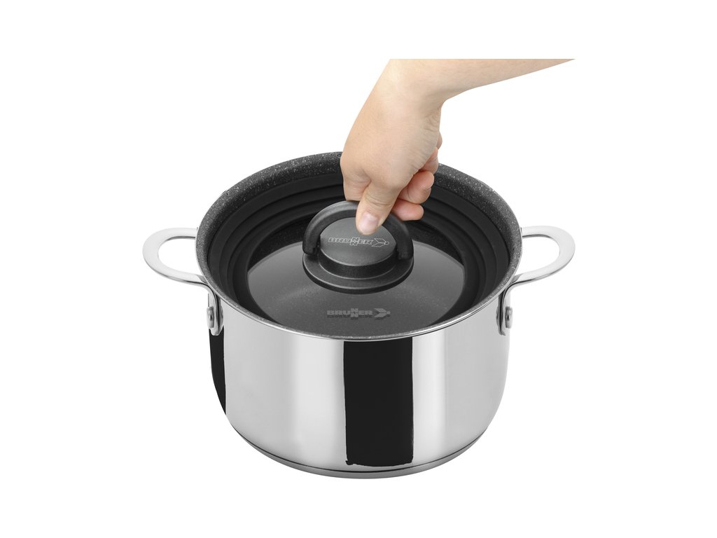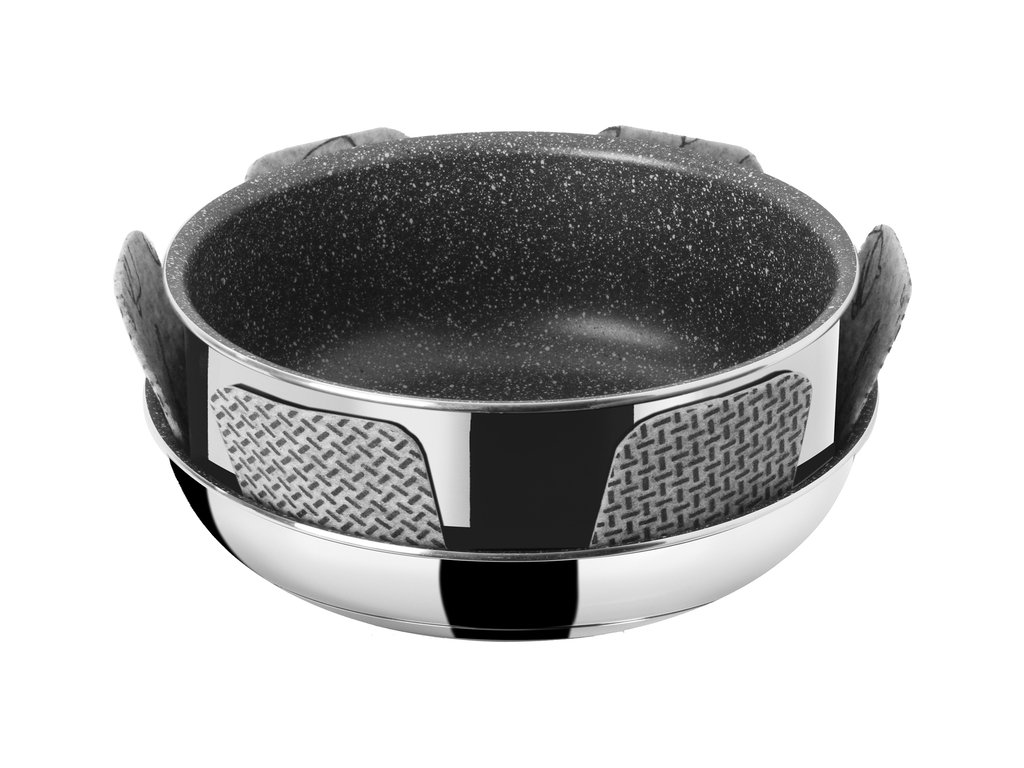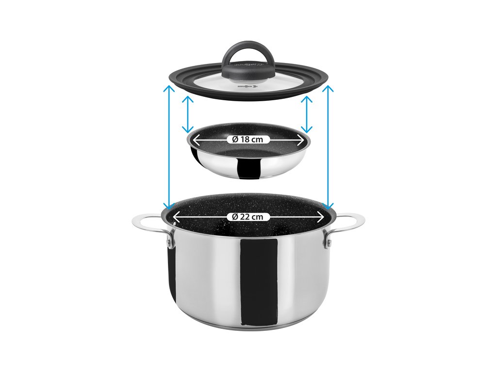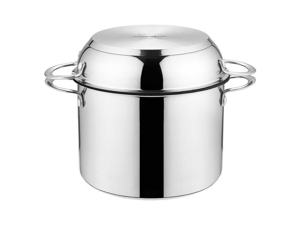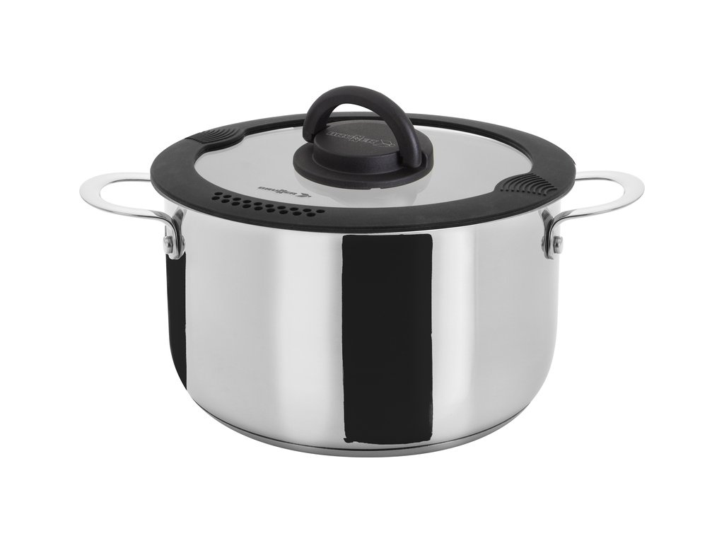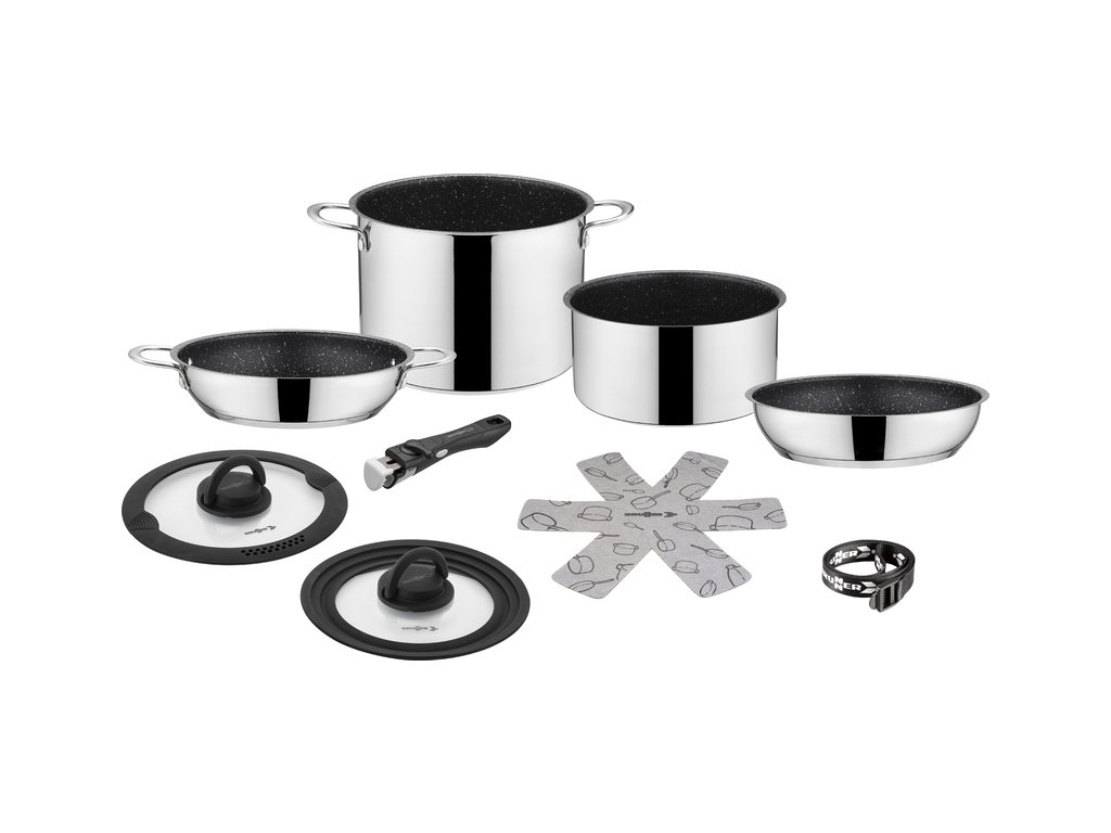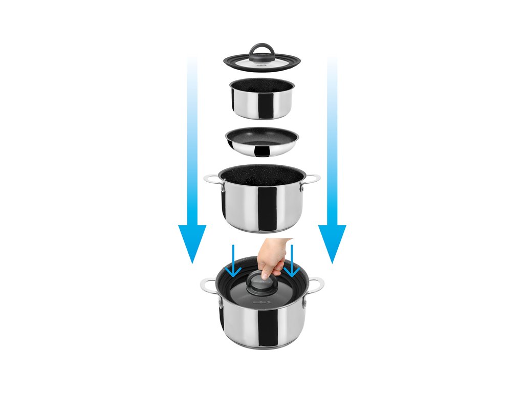 Vysoce kvalitní kolekce hrnců z nerezové oceli. Prostorově úsporný design. Obzvláště vhodný pro rekreační vozidla a lodě. Velký hrnec a pánev jsou vybaveny robustními rukojeťmi a termoizolačním dnem. Jsou vhodné pro plynové, elektrické, sklokeramické a indukční varné desky. Lze mýt v myčce nádobí. Se systémem Vacublock.