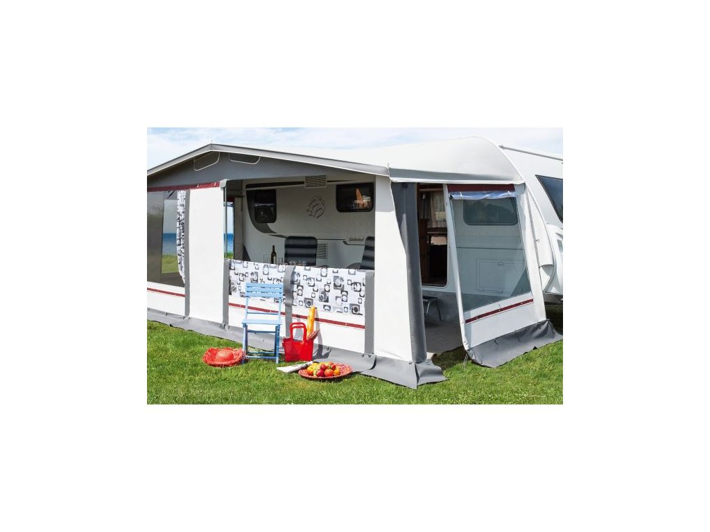 Atraktivní pětidílný model ve svěžím barevném provedení nabízí celou řadu funkcí. Všestranné využití, např. jako sluneční stříška, volitelně s bočnicemi nebo bez nich. Můžete si tak naplno užívat dovolenou v karavanu. Vchody v přední stěně a bočních stěnách umožňují snadný přístup do stanu. Štítové větrací otvory zajišťují příjemné vnitřní klima.