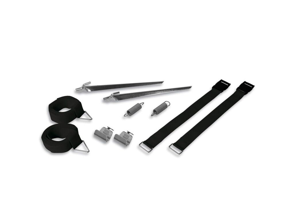 Rozsah dodávky: 2 x 3 m napínací popruhy, 2 zemní kolíky, 2 napínací pružiny, 2 háky pro podpěrné patky