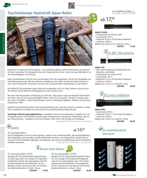 Mit einer beeindruckenden Lichtleistung von 200 bzw. 350 Lumen sorgen die HydraCell Taschenlam- 350 Lumen Lichtleistung