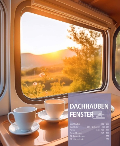 DACHHAUBEN FENSTER Dachhauben 243 – 256 Dachlüfter 244 – 245, 250 – 253, 257 Rollos 244, 260 – 263 Ausstellfenster 258 – 260 S4-Rahmenfenster 258 S4-Schiebefenster 258