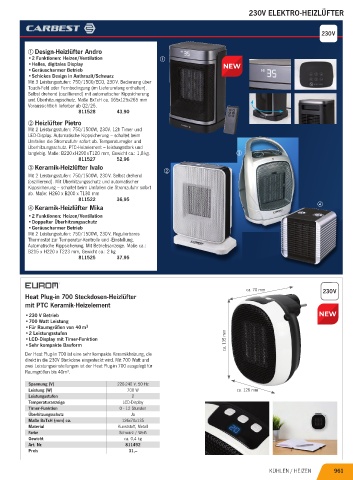 Mit 3 Leistungsstufen: 750/1500/ECO, 230 V. Bedienung über