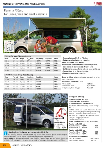 Awning widths: For Volkswagen Caddy kR, Citroën Berlingo, Peugeot Partner and Ford Tourneo Connect up Front and side walls Page 155-156