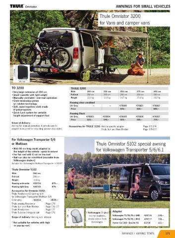 Awning for manual operation. A vehicle-specific Accessories for THULE 3200: Vehicle-specific adapter Page 172-174