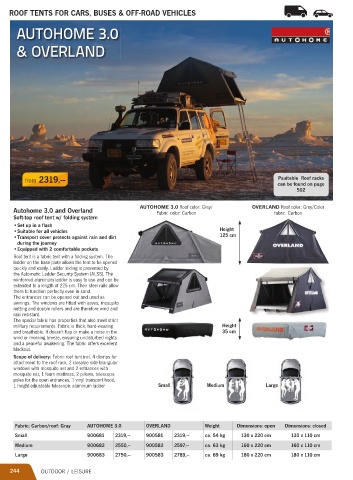 Fabric: Carbon/roof: Gray AUTOHOME 3.0 OVERLAND Weight Dimensions: open Dimensions: closed