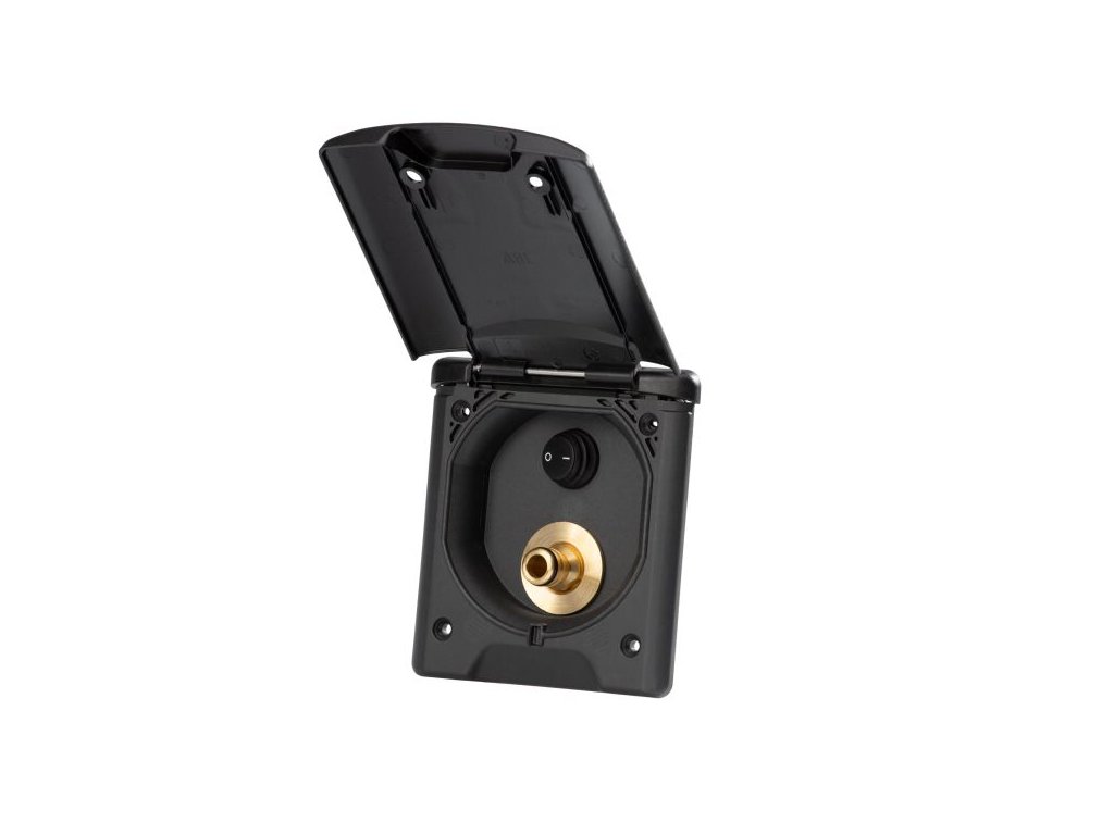 Venkovní vodovodní zásuvka s hadicovým připojením Gardena a vypínačem.