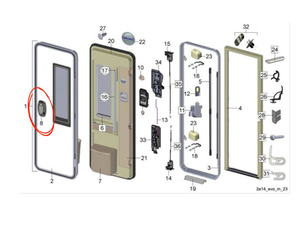 Originální venkovní zámek vstupních dveří určený pro obytné vozy EURA MOBIL Profila T 660EB, modelový rok 2025. Tento díl slouží jako přímá náhrada původního zámku a zajišťuje správnou funkci, bezpečné uzamčení a plnou kompatibilitu s originálním dveřním systémem výrobce.